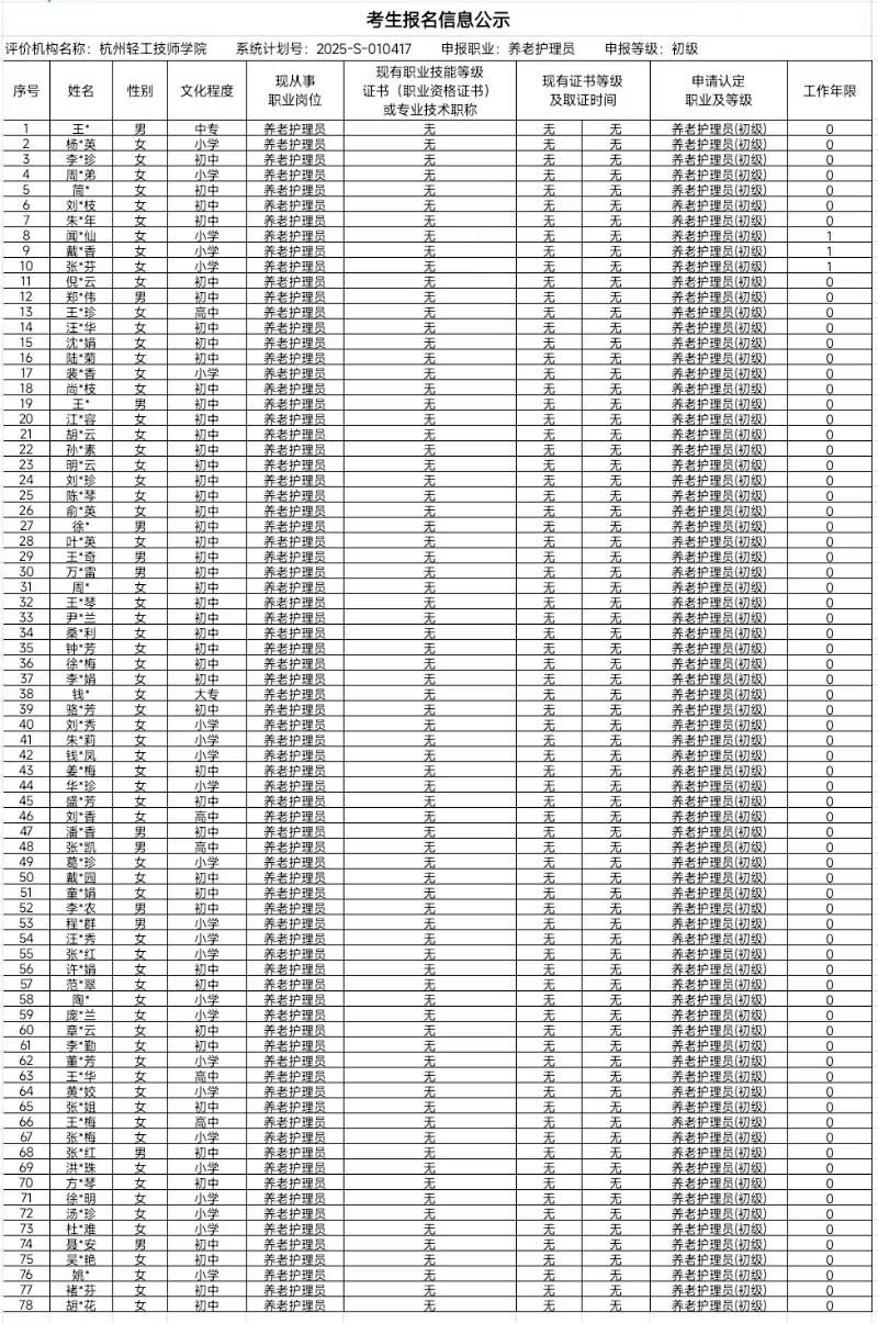 现将通过2025-S-010417批次养老护理员五级(初级)职业技能等级认定资格审核考生信息予以公示,公示期2025-12-15 17:00:00至2025-12-22 17:00:00,如对公示情况有异议,请电话或书面联系学院培训处。