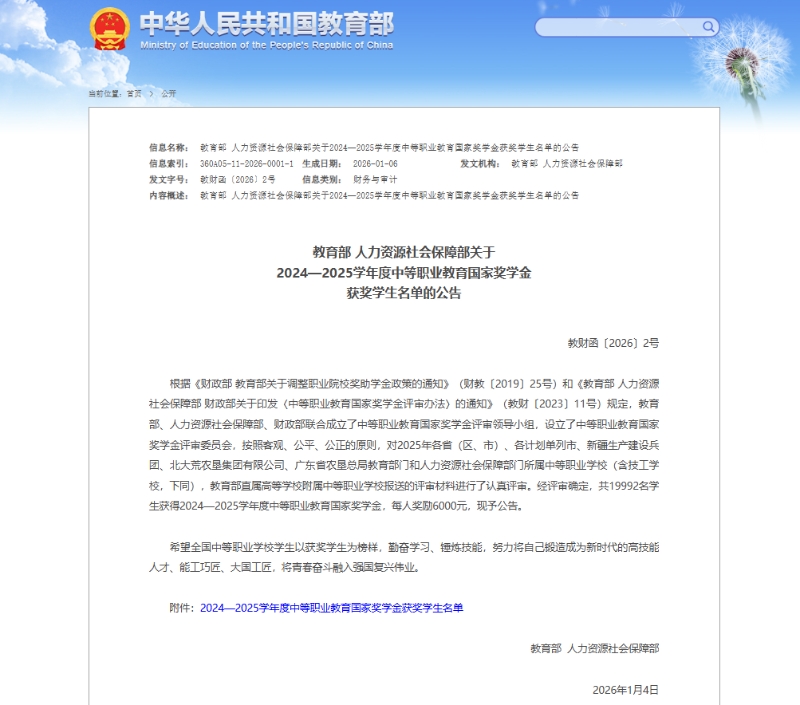 近日,教育部联合人力资源和社会保障部正式公布了2024—2025学年度中等职业教育国家奖学金的获奖名单。我院两位优秀学子凭借出类拔萃的综合素质和扎实过硬的专业能力,成功斩获这项国家级荣誉,每位获奖者将获得6000元奖励。让我们一起走近这些优秀榜样,感受他们的风采与力量!