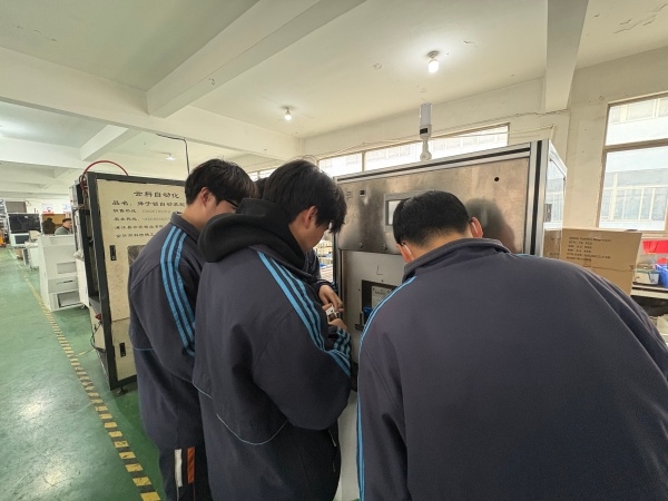 在企业现场,龚治全老师与企业负责人翁总进行了深度对接,师生团队实地调研了门锁检测装置的研发与应用情况。该装置通过机械结构带动门锁完成上万次重复动作,以此检测门锁耐久性,是机电一体化技术在工业检测领域的典型应用。学生们近距离观察设备运行、参与设备状态检查,龚老师则与企业方围绕装置控制要求、设备改造需求展开细致交流,明确了校企协同优化设备的具体方向。