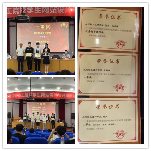 6月30日,在刚刚结束的2022年浙江省技工院校学生网站设计与开发技能竞赛中,我院电商专业井前程、陈阳两位同学在比赛中沉着应战,奋勇争先,分别荣获省赛一等奖、二等奖,贺成、陆凌艳两位老师荣获优秀指导教师奖。