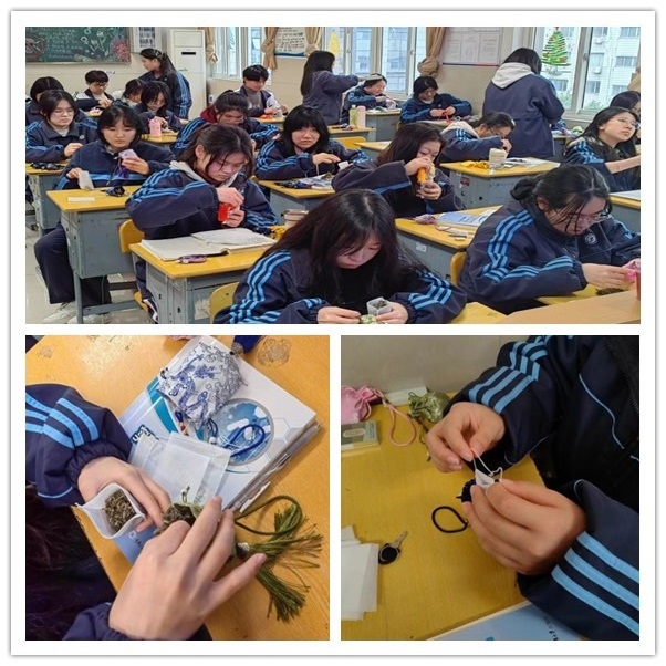 3月5日下午主题班会课上,班级团员带领全班进行香囊制作,发挥所学专长,进行劳动技能教育主题学习。经过鉴别药材、筛选过滤、灌装制作、完成缝合等工序,完成一百份香囊的制作。
