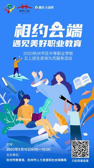 5月16日上午9:00至下午3:00,杭州市教育局、市人力社保局将联合腾讯大浙网举办“相约云端遇见美好职业教育——2020年杭州市区中等职业学校云上招生咨询为民服务活动”。