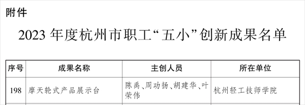 近日,杭州市总工会与市科技局、市科协正式揭晓了2023年度杭州市职工“五小”创新成果200例名单,本次评选在全市范围内择优推荐了共387项创新成果,最终经专家评审,我院研发的《摩天轮式产品展示台》凭借其独特的创意和实用性成功入选。