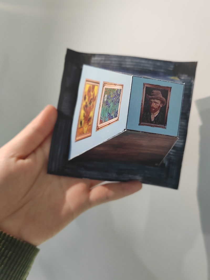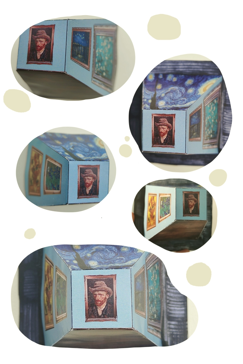 苏杭扬同学解释,这个小玩意看起来简单,但是需要懂一点透视原理,再懂一点色彩搭配,辅助Photoshop软件操作,最后还要做一点手工活才能做出来。透视要让每一幅画都有正确的透视感,色彩让整个“艺术画廊”搭配协调,PS的熟练运用和手工辅助增加了裸眼3D的视觉效果,“就是说每一步都有一点小心机呢”她得意地介绍。
