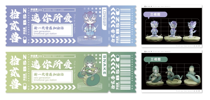 在平面兴趣小组活动的时候,苏杭扬经常会看到李玉应学长的毕设《拾贰兽》,十二只小兽各有性格,造型迥异,古灵精怪又生动可爱。李玉应的设计使用潮玩元素设计传统生肖IP、结合3D打印,摆在展台中吸引着无数像苏杭扬这样热爱设计的艺术系学子驻足观看。“这些建模真好看,希望我的毕设也能做的这么好!”苏杭扬说:“我要再努力一些才行!”