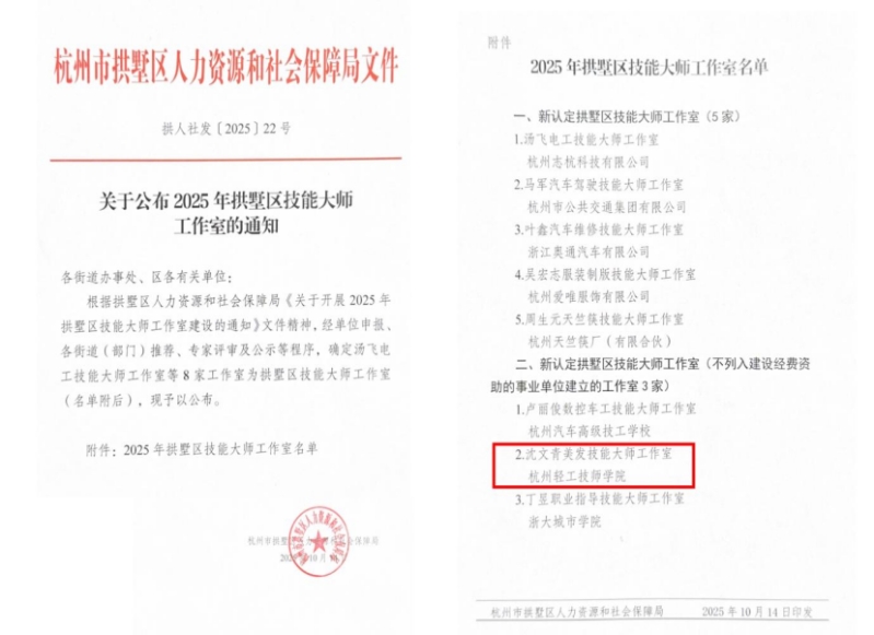 近日,拱墅区人力资源和社会保障局正式发文,杭州轻工技师学院艺术设计与制作高水平专业群沈文青美发技能大师工作室成功获批成立!这是学院艺术设计与制作高水平专业群继深化技能人才培养、推进产教融合后的又一重要成果,标志着学院专业群在美发专业高技能人才培育领域迈入专业化、精细化发展新阶段。