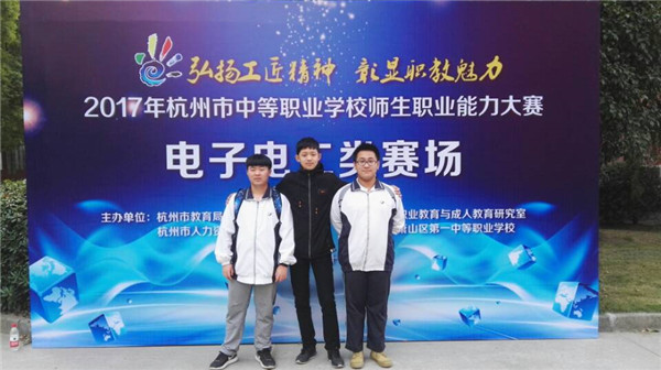 11月10-11日,2017年杭州市中职学校师生职业能力暨省选拔赛中的电子电工专业师生职业能力大赛在杭州市萧山区第一中等职业学校举办。我院机电系电子兴趣小组的黄天炀、秦涵祥两位同学参加电子产品装配与调试项目比赛,经过了4个小时的激烈比拼,黄天炀同学获得了三等奖。