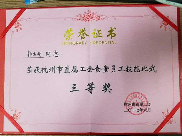 2017年6月24日,我院参加由杭州市直属工会举办的优秀职工食堂展评和食堂员工厨艺大比武活动,其中优秀职工食堂展评通过硬件条件设施、就餐环境与卫生、菜品种类与丰富程度、食堂特色、菜品价格与管理制度等环节进行评分,食堂员工厨艺大比武通过刀工、色泽、口感、数量等方面进行评分,我院参赛人员在吴应霞、何德强两位副院长的带领下,经过紧张激烈的比赛,分别获得杭州市直属工会系统优秀职工食堂和杭州市直属工会食堂员工技能比武三等奖的荣誉。