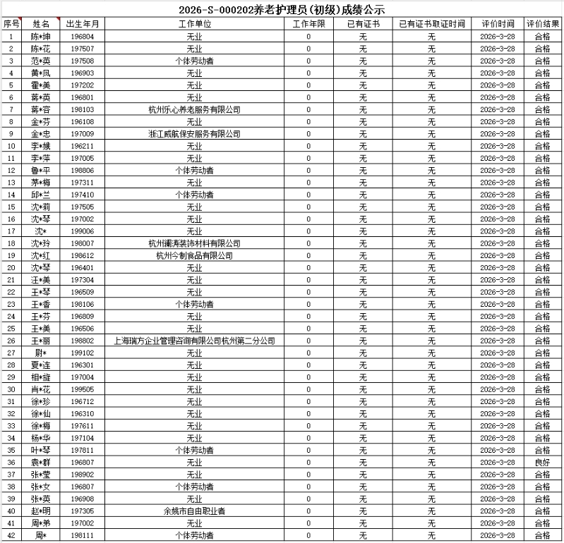现将2026-S-000202批次养老护理员五级(初级)职业技能等级认定成绩予以公示,公示期2026-4-1 17:00:00至2026-4-9 17:00:00,如对公示情况有异议,请电话或书面联系学院培训处。
