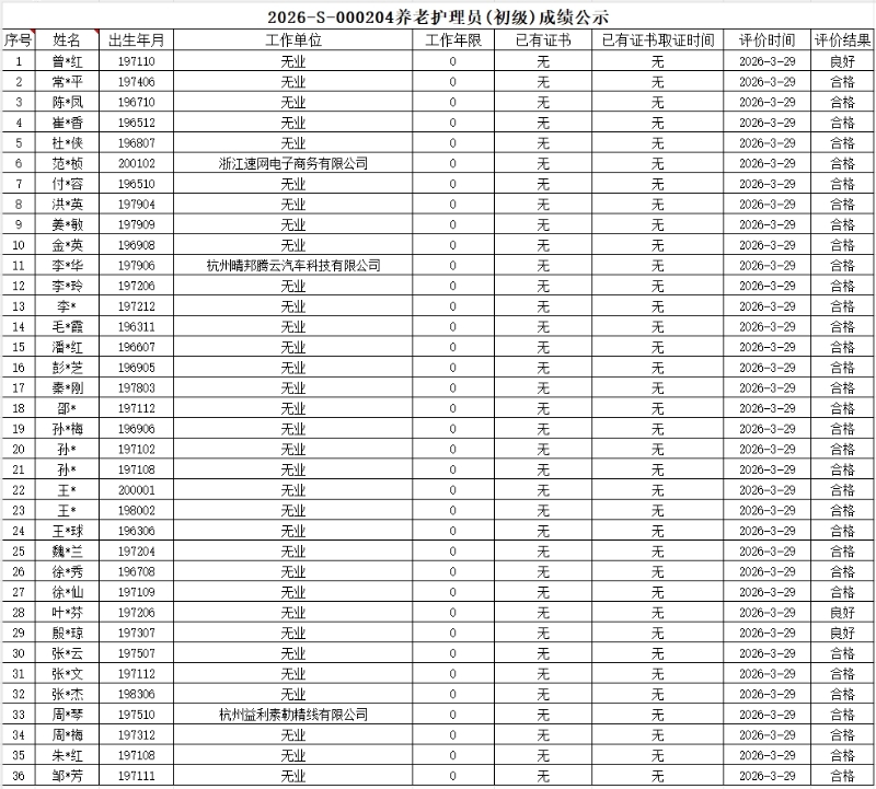 现将2026-S-000204批次养老护理员五级(初级)职业技能等级认定成绩予以公示,公示期2026-4-1 17:00:00至2026-4-9 17:00:00,如对公示情况有异议,请电话或书面联系学院培训处。