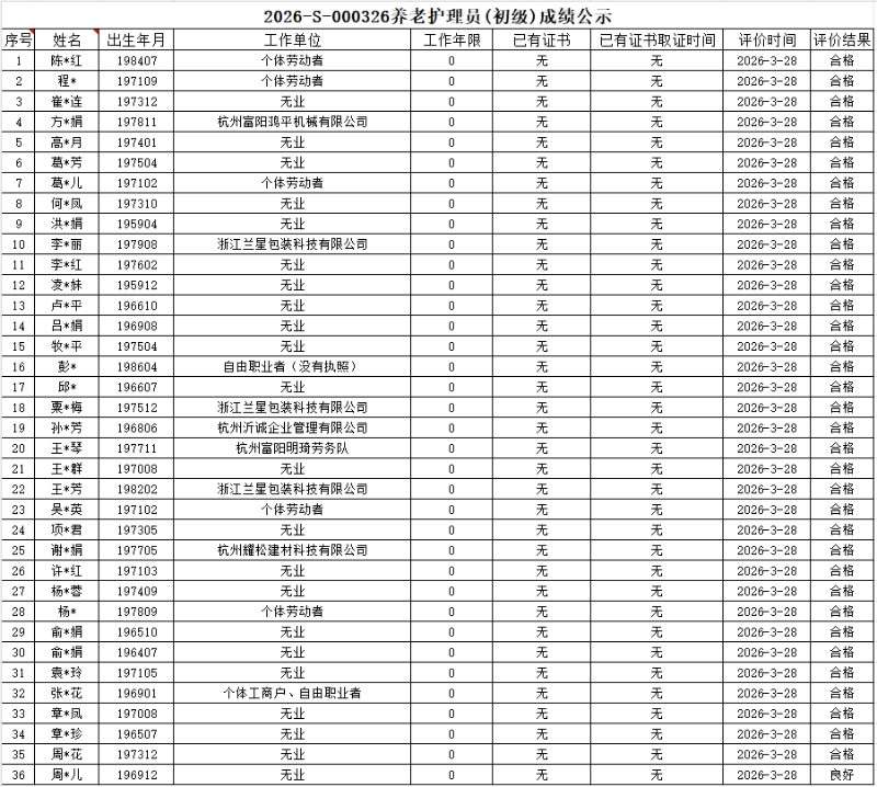 现将2026-S-000326批次养老护理员五级(初级)职业技能等级认定成绩予以公示,公示期2026-4-1 17:00:00至2026-4-9 17:00:00,如对公示情况有异议,请电话或书面联系学院培训处。