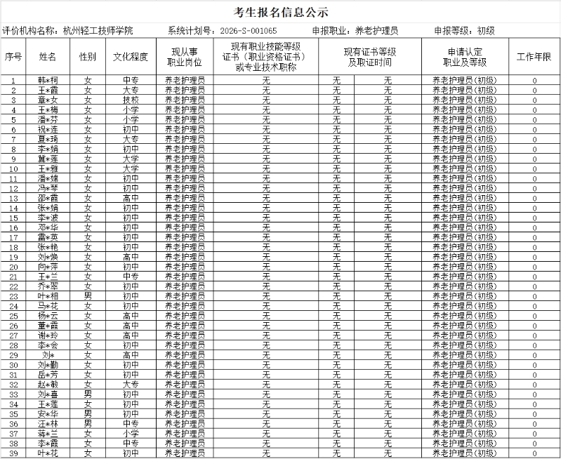 现将通过2026-S-001065批次养老护理员五级(初级)职业技能等级认定资格审核考生信息予以公示,公示期2026-4-1 17:00:00至2026-4-9 17:00:00,如对公示情况有异议,请电话或书面联系学院培训处。