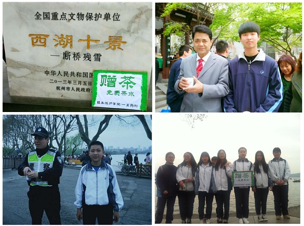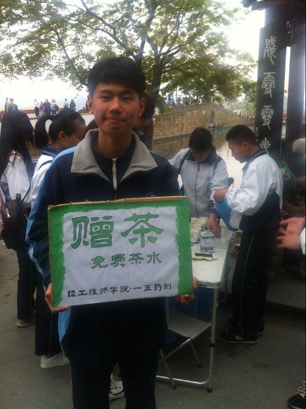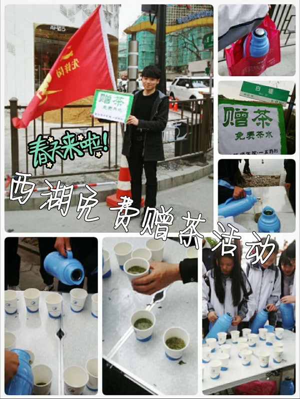 春风拂面的三月象征着万物的生机盎然,3月29日,15药剂10余名同学在班主任带领下,来到春光旖旎的西湖边为游客们免费送茶。