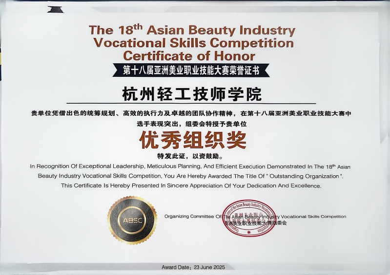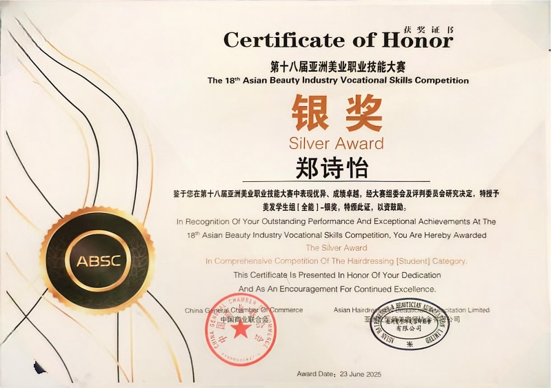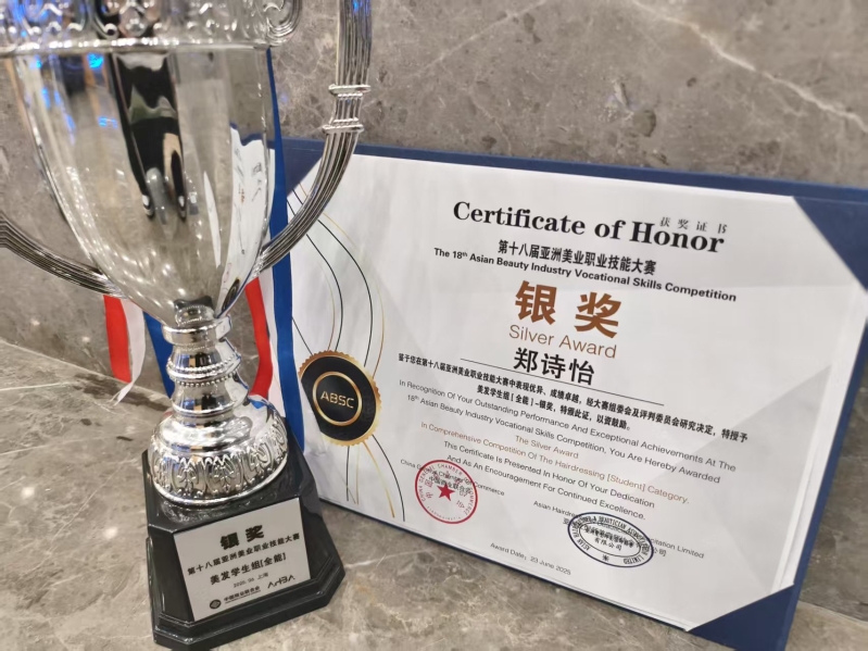 获奖同学郑诗怡说:“比赛最大的挑战是现场应变,当得知自己获得银奖时,心情特别激动。在这次大赛中,我见识到了亚洲美业的广阔天地,也看到了自己的优势和不足。我会把这次的获奖当作前进的动力,继续努力提升自己的专业技能。”