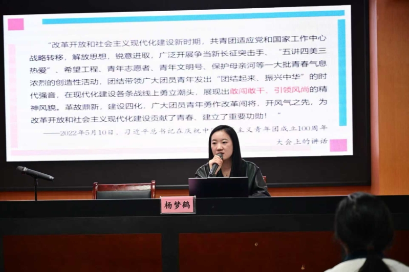 在“走进共青团”课堂上,杨梦鹤老师以时间为轴,生动回溯了共青团从革命年代到新时代的奋斗历程,系统阐释了共青团的性质、宗旨、组织架构及核心使命。她结合学院专业特色,重点分享了各行各业青年技能人才立足岗位、攻坚克难的先进事迹。让学生们深刻认识到,共青团不仅是先进青年的群众组织,更是引领青年投身国家建设、实现人生价值的重要平台。课堂上,杨老师通过案例分析、互动提问等形式,引导学生们思考“青年与时代的关系”,进一步激发了大家的家国情怀与责任担当。