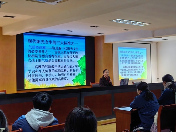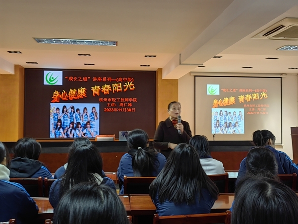 为了帮助学生了解生理心理的变化,懂得自尊自爱、自重自护,珍爱生命,珍惜青春。能自觉遵守中学生的行为规范,努力学习,积极进取,美丽自我,树立正确的人生观,做一个高素养高品位的阳光女孩。杭州轻工技师学院于11月23号和30号下午分别在环城北路校区以及莫干山路校区开展了青春健康讲座。