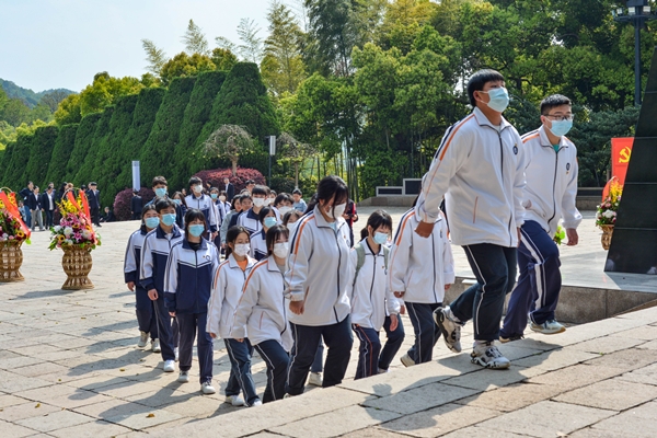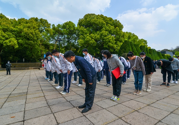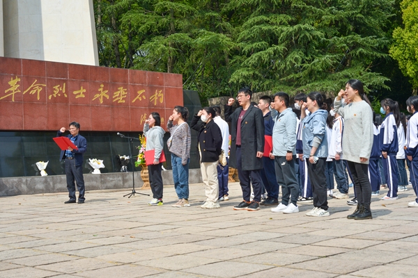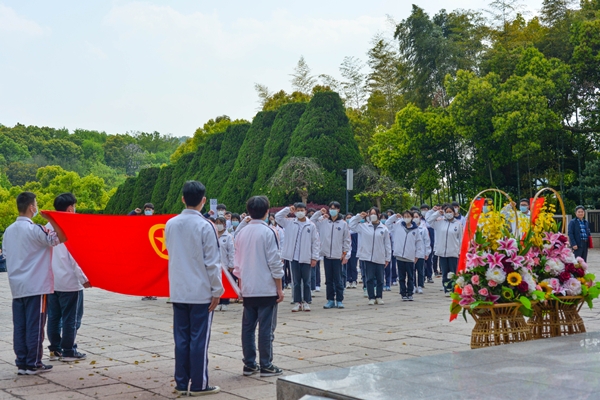 随后,全体肃立,向英烈默哀一分钟,表达对革命烈士的沉痛哀思。默哀结束,全体师生向革命烈士三鞠躬。