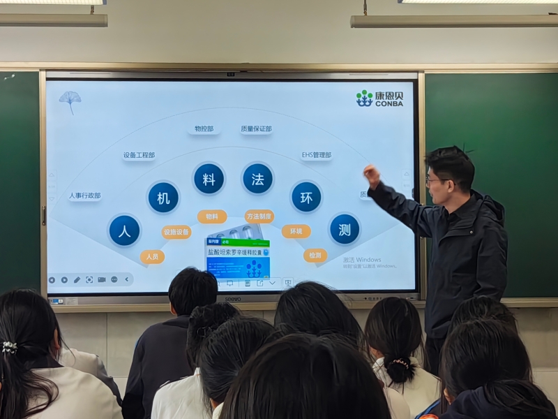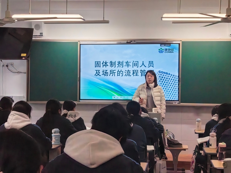 活动特邀康恩贝生产管理与质量管理领域高技能人才,结合22级药剂专业学生本学期《GMP实务》课程内容进行专题授课。质量部工程师项琪深入讲解了制药企业生产质量管理的全流程、关键控制点以及质量风险管理体系,夯实了学生的质量意识基础。