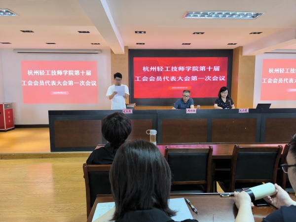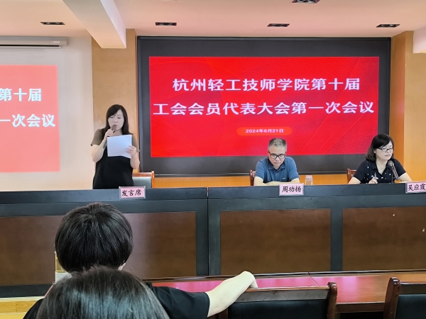 6月21日下午,学院召集第十届教职工正式代表、列席代表,在莫干山路102号校区九楼会议室,召开学院第十届工会会员代表大会第一次会议。学院党委书记周功扬、第九届工会主席吴应霞出席。