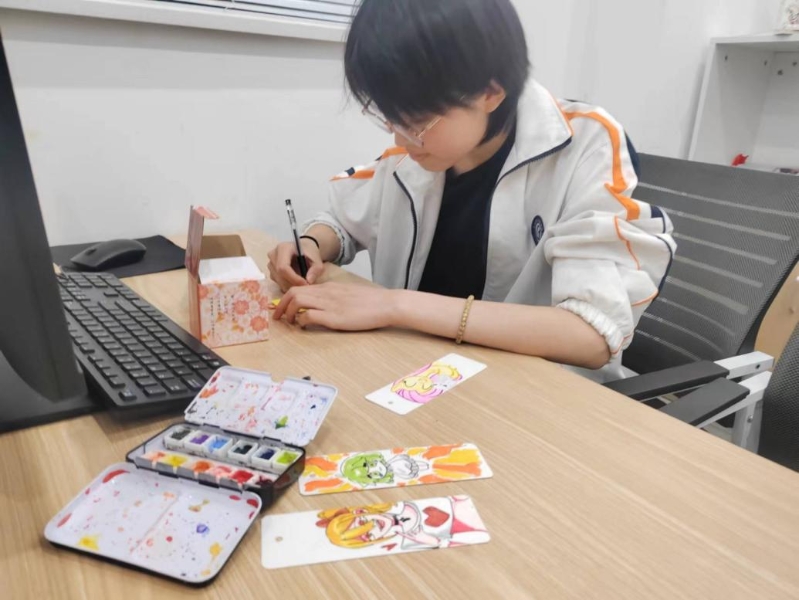 刚刚下课的小高同学迈着轻快的步伐,推开了艺术系平面设计技能提升中心的玻璃门,映入眼帘的是整洁的桌面和崭新的电脑。“你来啦,今天我们要画书签噢,画好的书签可以挂在风铃上,快来试试!”艺术系骨干教师邹老师微笑着说,并把今天制作书签和风铃的材料放在小高的面前。“画什么都可以吗邹老师?”“当然啦,我们艺术系动漫兴趣小组的宝贝们可都是快乐的设计师呀!”