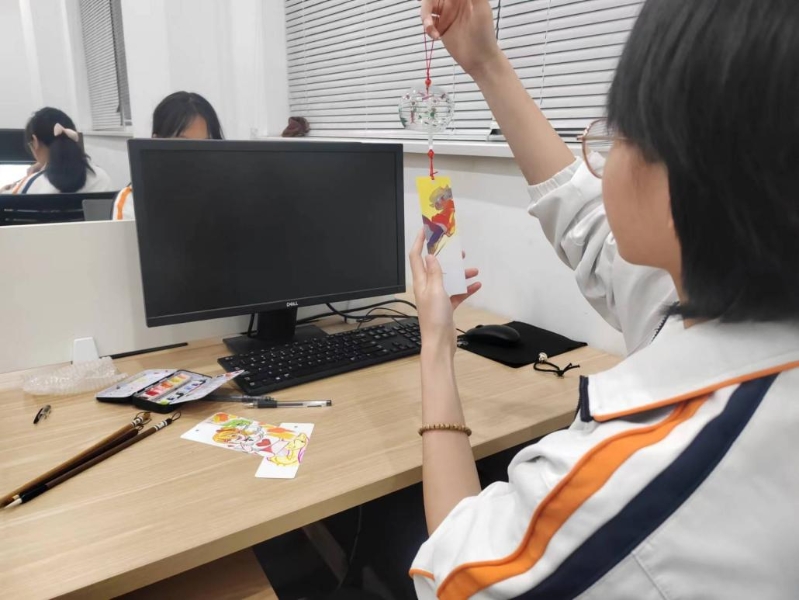 此时,伴随柔软的风,茉莉花的清香沁人心腑,小高正在纸上刷刷创作,阳光洒落下来,在她认真的脸上吹起一层薄薄的金色光辉。其他小设计师已经将自己想象的画面绘制在书签上了,她们细心的将画好的书签串起来,做成随风摇曳的风铃,挂在实训基地的窗前。随着轻快的风,风铃们也唱起叮叮咚咚的歌,而小设计师们的梦想也在此时,伴随风与阳光,乘风万里,遨游云间。