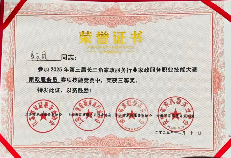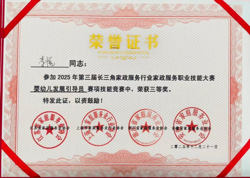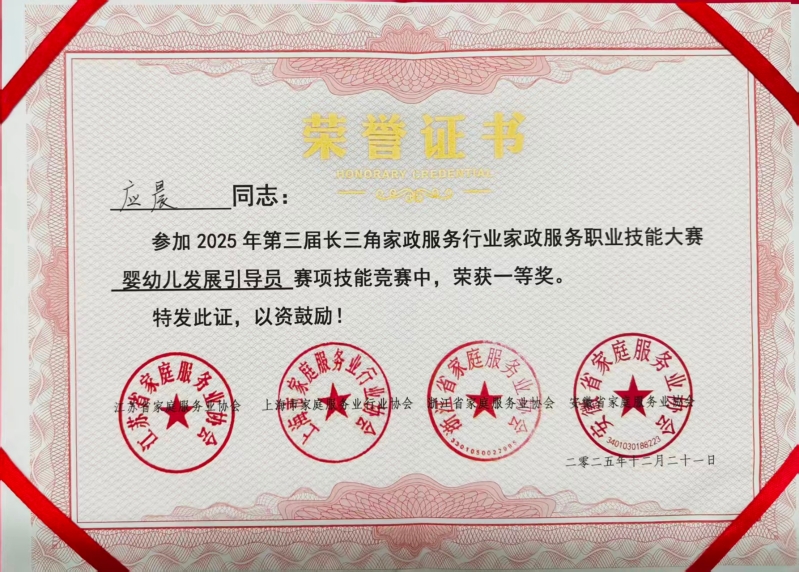12月20日,应晨、李悦、吴玉凤三位老师代表浙江队出征第三届长三角家政服务职业技能竞赛,与江、浙、沪、皖四地选手在婴幼儿发展引导员、家政服务员两个赛项进行切磋。本次竞赛她们除理论考核之外,还需要根据职业内容,进行婴幼儿发育行为筛查、家庭教育指导、家务服务、母婴护理、家庭照护等全方位技能比拼。最终,应晨老师夺得婴幼儿发展引导员赛项一等奖,李悦老师获同赛项三等奖,吴玉凤老师获家政服务员赛项三等奖,展现了出色的综合素养,为浙江代表队团体成绩增光添彩。