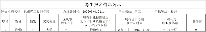 现将通过2025-S-010414批次电工二级(技师)职业技能等级认定资格审核考生信息予以公示,公示期2025-12-10 17:00:00至2025-12-17 17:00:00,如对公示情况有异议,请电话或书面联系学院培训处。