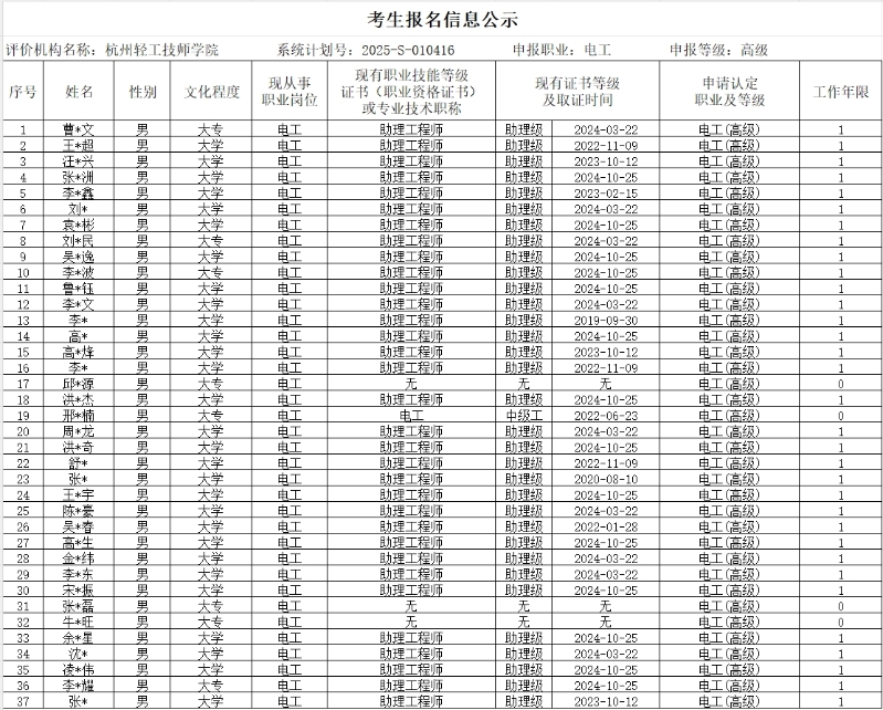 现将通过2025-S-010416批次电工三级(高级)职业技能等级认定资格审核考生信息予以公示,公示期2025-12-10 17:00:00至2025-12-17 17:00:00,如对公示情况有异议,请电话或书面联系学院培训处。