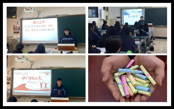 各班团支书作为成人代表表达了对成年的喜悦,并纷纷表示要牢记青年公民的使命担当,心怀感恩,奉献社会,拼搏进取,谱写出我们出彩的人生。班级其他同学也撰写了献给自己的成年寄语,表达了对自己美好未来的憧憬和祝福。