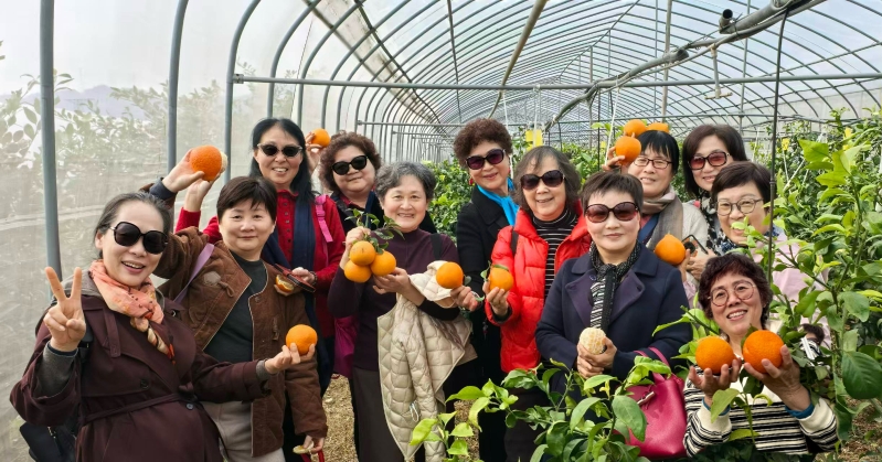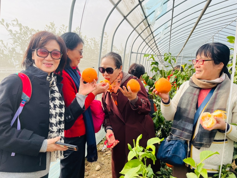 农庄负责人热情地向退休教职工们介绍红美人的种植情况及采摘要点。退休教职工们纷纷领取剪刀,兴致勃勃地走进果园开始采摘。有的老师微微侧身,小心翼翼地剪下悬挂在角落里色泽最佳的果实;有的老师则两两协作,一人扶枝一人剪果,默契十足;还有的老师一边采摘,一边品尝刚摘下的柑橘,清甜的汁水在口中迸发,引得大家连连称赞。83岁的退休老教师吴老师拿着刚采摘的果实笑着说:“亲手采摘的乐趣是花钱都买不来的,参加这次活动太开心了!” 采摘间隙,老同志们还不忘拍照留念,金黄的果实、灿烂的笑容与翠绿的枝叶相映成趣,定格下一个个温馨美好的瞬间。