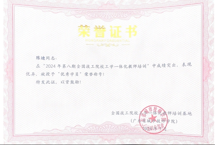陈迪老师在三级的基础上,开展工学一体化任务策划、考核设计、资源开发等内容的学习,立足实际教学,进行学习任务工作页、信息页设计与编写,并进行示范课实际与实施。通过不断地磨合、推翻、再设计,每次课程的学习任务策划越来越完善,考核方案不断全面,每天的“培训作业”亮点不断!在最终的考核中陈迪老师以优异的表现获得“优秀学员”荣誉!
