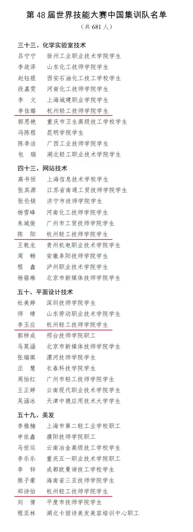 近日,人力资源和社会保障部正式印发通知,公布第48届世界技能大赛中国集训队名单。我院参赛选手李玉应、李佳璐、陈阳、郑诗怡4人凭借扎实的专业技能和出色的竞技表现,全部成功入选,分别跻身平面设计技术、化学实验室技术、网站技术、美发4个项目的国家集训队,为学院乃至浙江省职业技能人才培养再添亮眼成绩。