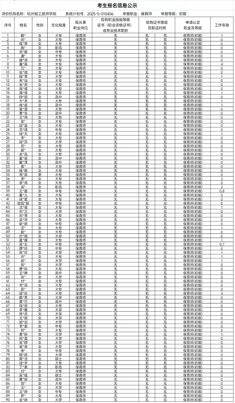 现将通过2025-S-010406批次保育师五级(初级)职业技能等级认定资格审核考生信息予以公示,公示期2025-12-12 17:00:00至2025-12-19 17:00:00,如对公示情况有异议,请电话或书面联系学院培训处。