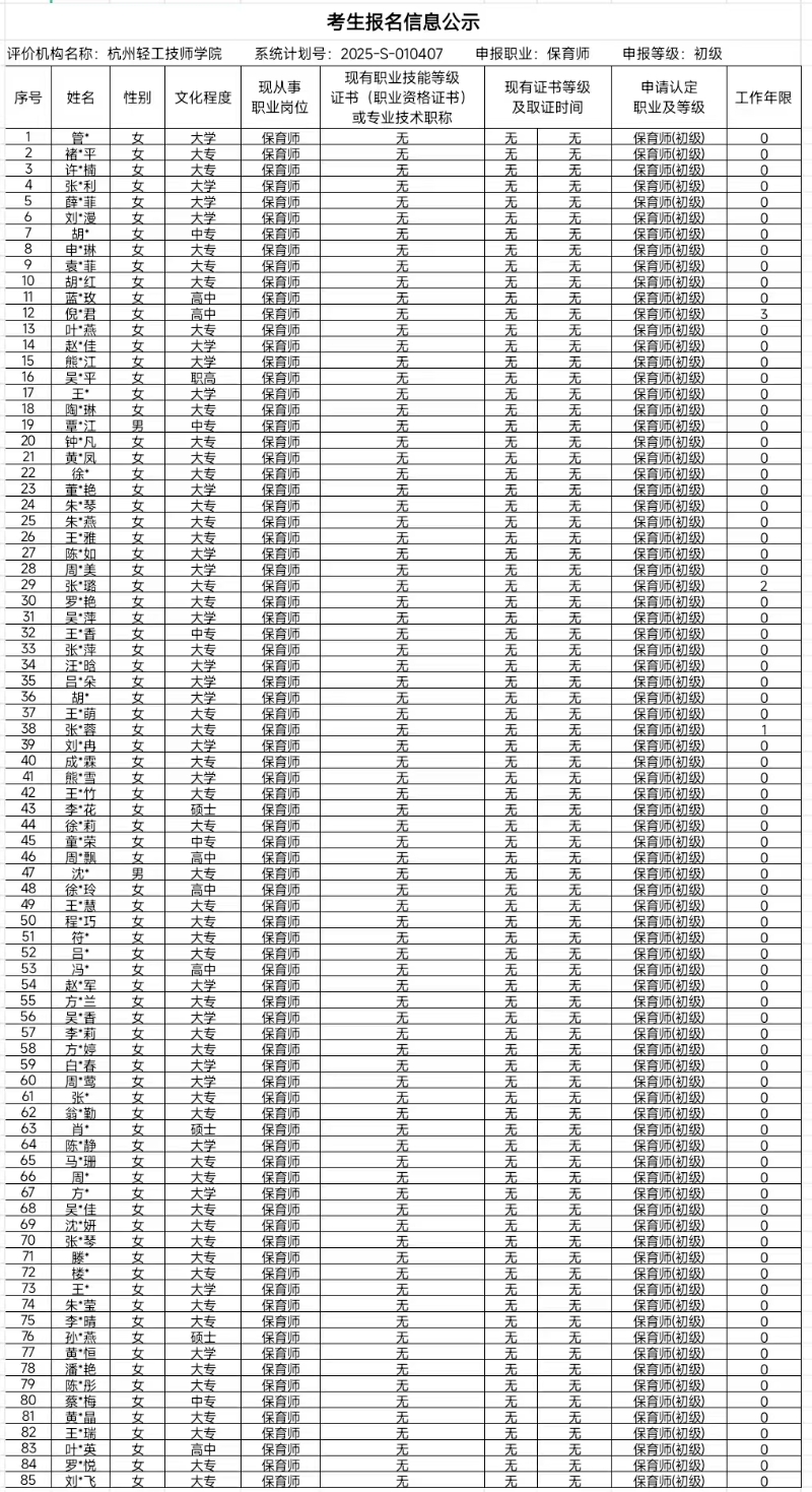 现将通过2025-S-010407批次保育师五级(初级)职业技能等级认定资格审核考生信息予以公示,公示期2025-12-12 17:00:00至2025-12-19 17:00:00,如对公示情况有异议,请电话或书面联系学院培训处。