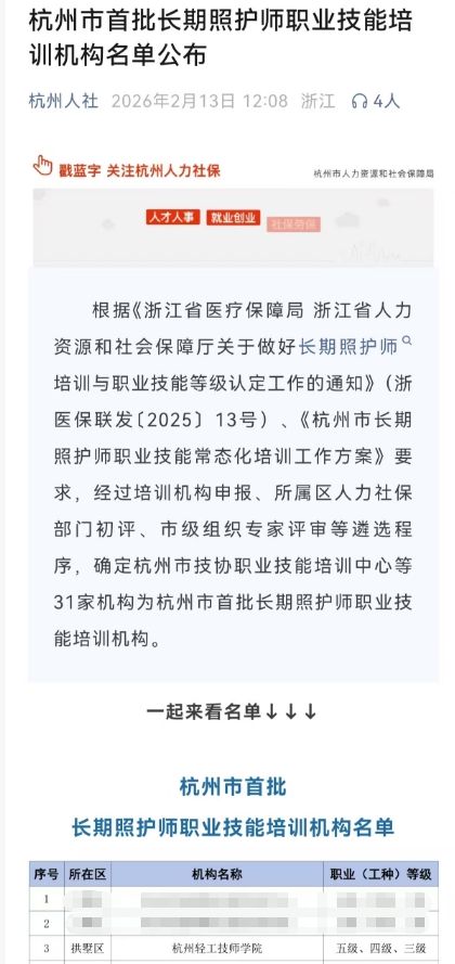 近日,杭州市人力社保局、市医保局联合公布了杭州市首批长期照护师职业技能培训机构名单,杭州轻工技师学院凭借扎实的办学基础、专业的师资团队和规范的培训体系,成功入选,可开展长期照护师五级(初级)、四级(中级)、三级(高级)全等级职业技能培训。
