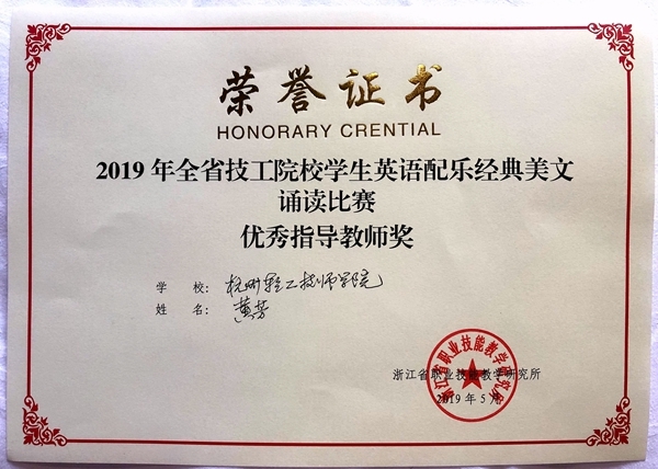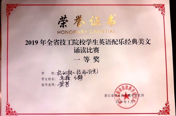 5月22至23日,2019年浙江省技工院校学生英语配乐经典美文诵读比赛在湖州交通技师学院(筹)举行。本次比赛以“Don’t be shy, I’mthe best!(别害羞,我是最棒的!)”为主题,共有38个来自各地市技工院校的学生团队参加比赛。我院15中药班王静与17中药班高鑫团队表现优异,最终喜获一等奖,黄芳老师获优秀指导教师奖。